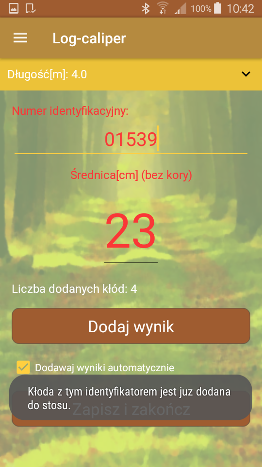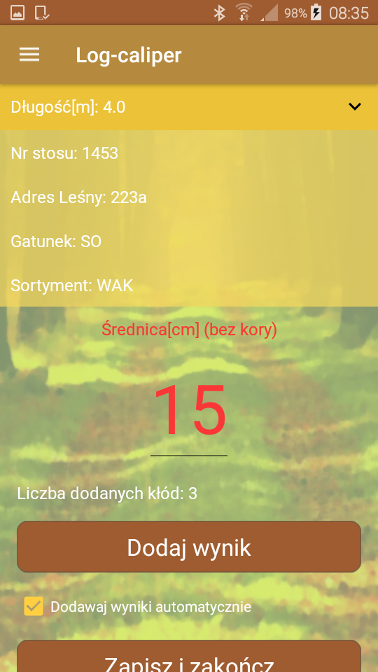 W aplikacji leśnej Log-caliper numer stosu lub kolejnej kłody może być wprowadzany ręcznie lub w przypadku oznaczników z kodem kreskowym (np. BC LASER) za pomocą skanera, montowanego do średnicomierza. Skaner kodów kreskowych łączy się z urządzeniem mobilnym poprzez komunikację bezprzewodową i poprzez wciśnięcie przycisku skanowania z boku urządzenia odczyt kodu przesyłany jest do poziomu aplikacji.