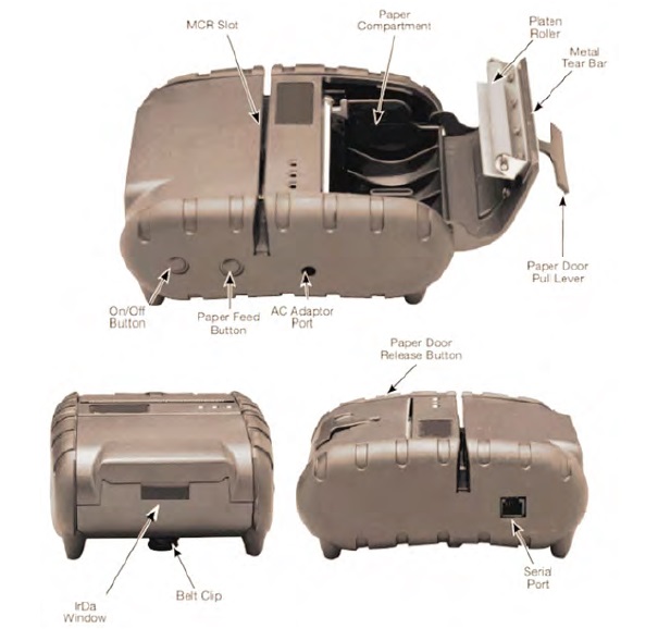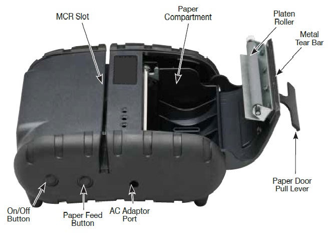 Diody LED wskazują komunikację, ładowanie i stan zasilania. Dodatkowo posiada proste ładowanie papieru i zewnętrzne gniazdo DC 12V do szybkiego ładowania baterii.