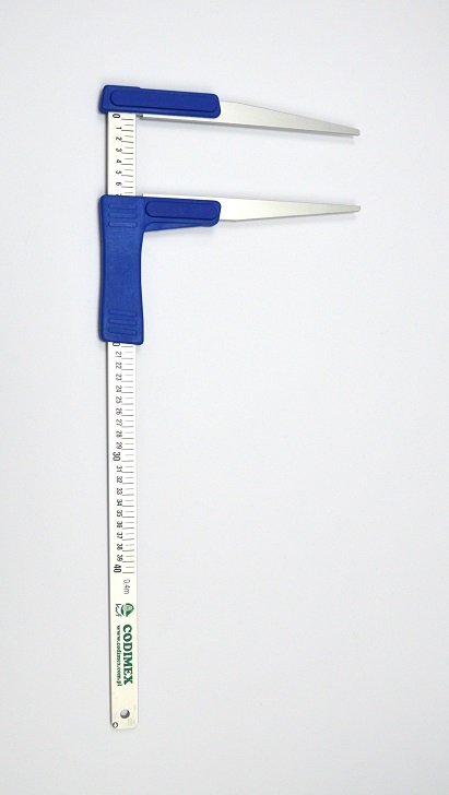 Element mocujący ramię stałe średnicomierza ma szerokość 25 mm, co umożliwia wsunięcie średnicomierza pod leżące kłody celem dokonania ich pomiaru.